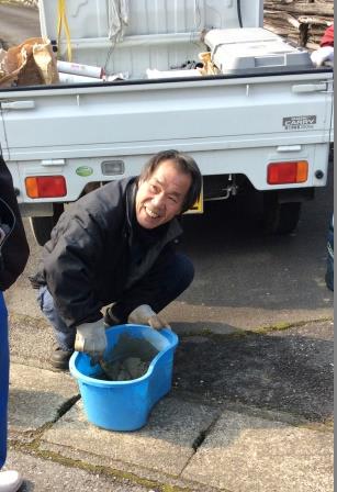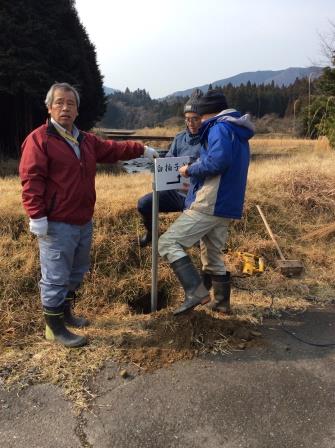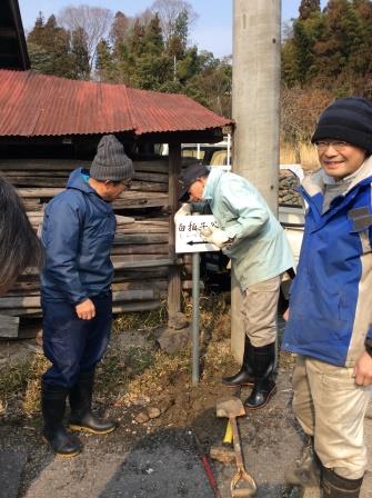 まず、穴を掘って杭を打ち込み、案内板を取り付け、足元がぐらぐらしないように石ころとセメントを流し込みます。そしてその上から土をかぶせ、できあがり。